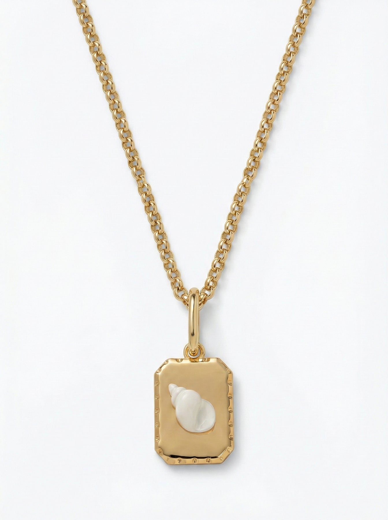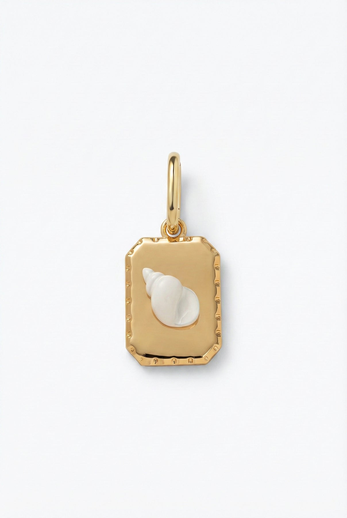 The Isla White Shell charm features a rectangular gold tag features a raised, pristine white conch shell that pops against the high-polish gold background. The edges are finished with a delicate beaded texture, giving it the feel of a vintage luxury find rather than a typical beach souvenir. Suspended from our signature clip bail, it’s the perfect anchor for a layered stack, even if you’re completely landlocked.ater & tarnish resistant, hypoallergenic