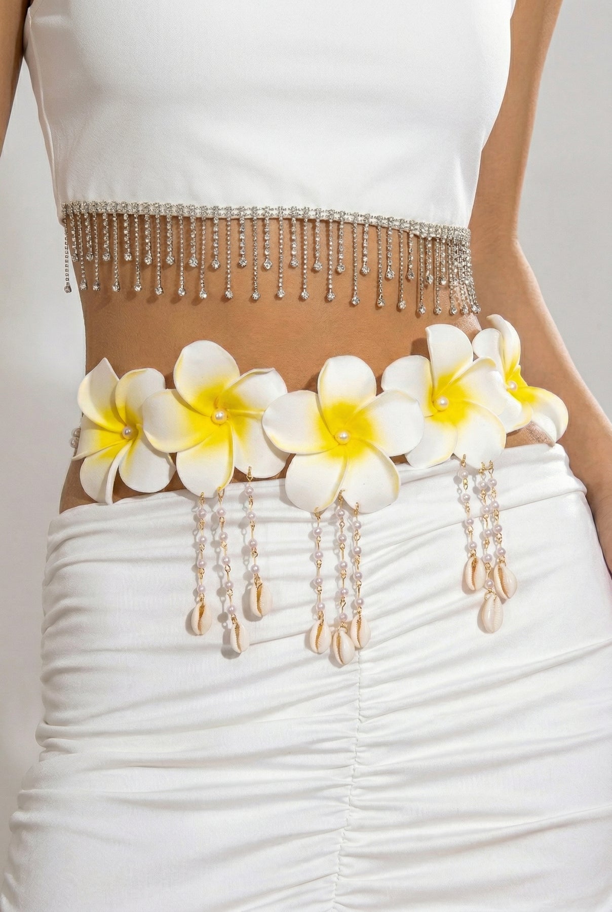 Say aloha to your next obsession. This waist chain is bringing all the vacation goddess vibes—five dreamy plumeria flowers with pearl centers, dangling faux shell charms, and sparkly crystal beading for that extra twinkle when you move. Adjustable fit, light-as-air feel, and ready to turn a simple 'fit into a full-on moment.