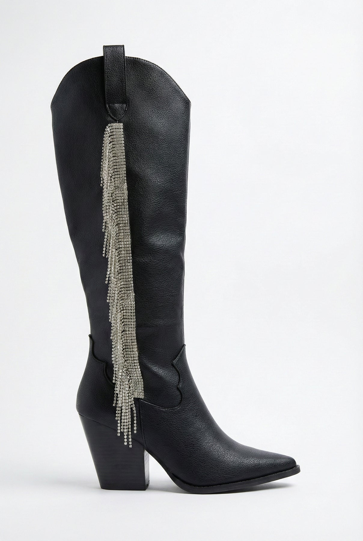 A statement boot with serious attitude. These western-inspired boots feature a sleek silhouette accented with rhinestone fringe that moves with every step. Designed with a comfortable block heel and padded insole, they bring just the right mix of edge and wearability.