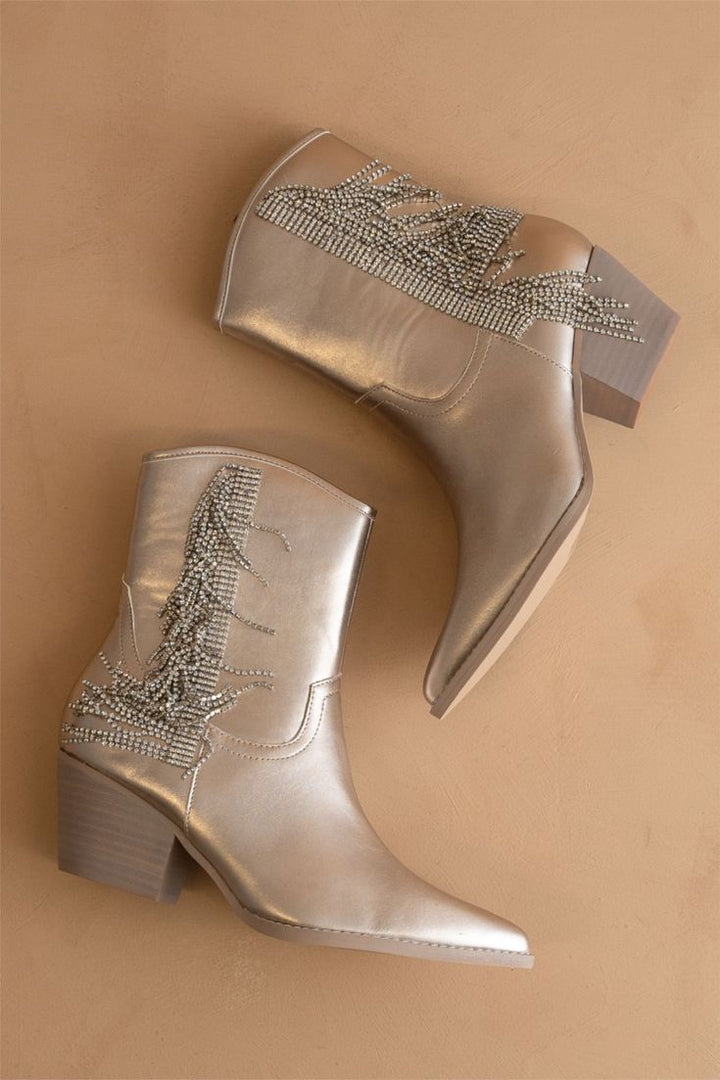 Perfect for a night out on the town in Nashville or any Western-themed bachelorette party, these boots are a must-have for any stylish cowgirl. Featuring cowgirl bling sparkle rhinestone fringe detailing, these boots are sure to make a statement wherever you go. The short ankle design keeps things modern and trendy, while the Western style adds a classic touch.