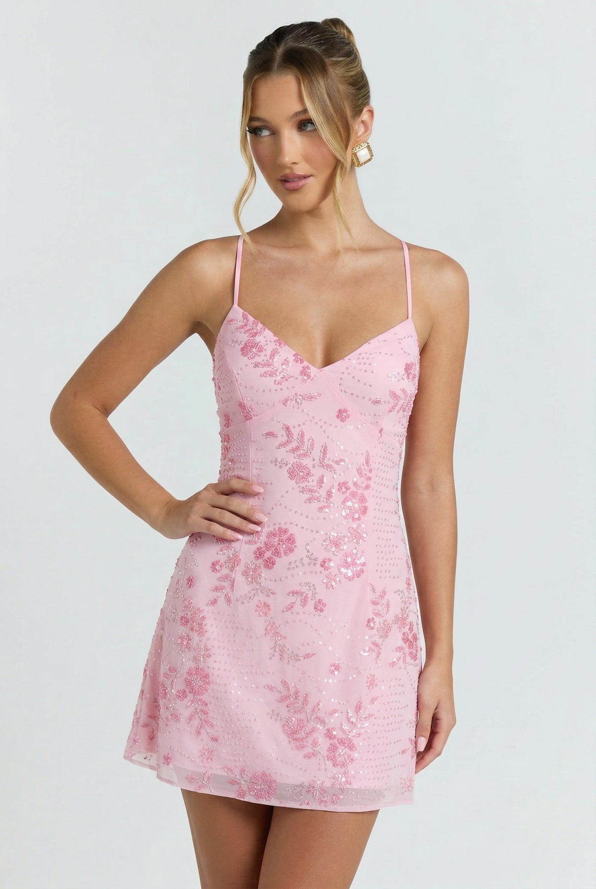 The Blush Petal Beaded Mini Dress is made for girls who love a flirty moment — featuring an allover beaded floral design that catches the light with every move. The lace-up back lets you customize your fit, while the V-neckline and body-skimming silhouette create that effortless, feminine shape.