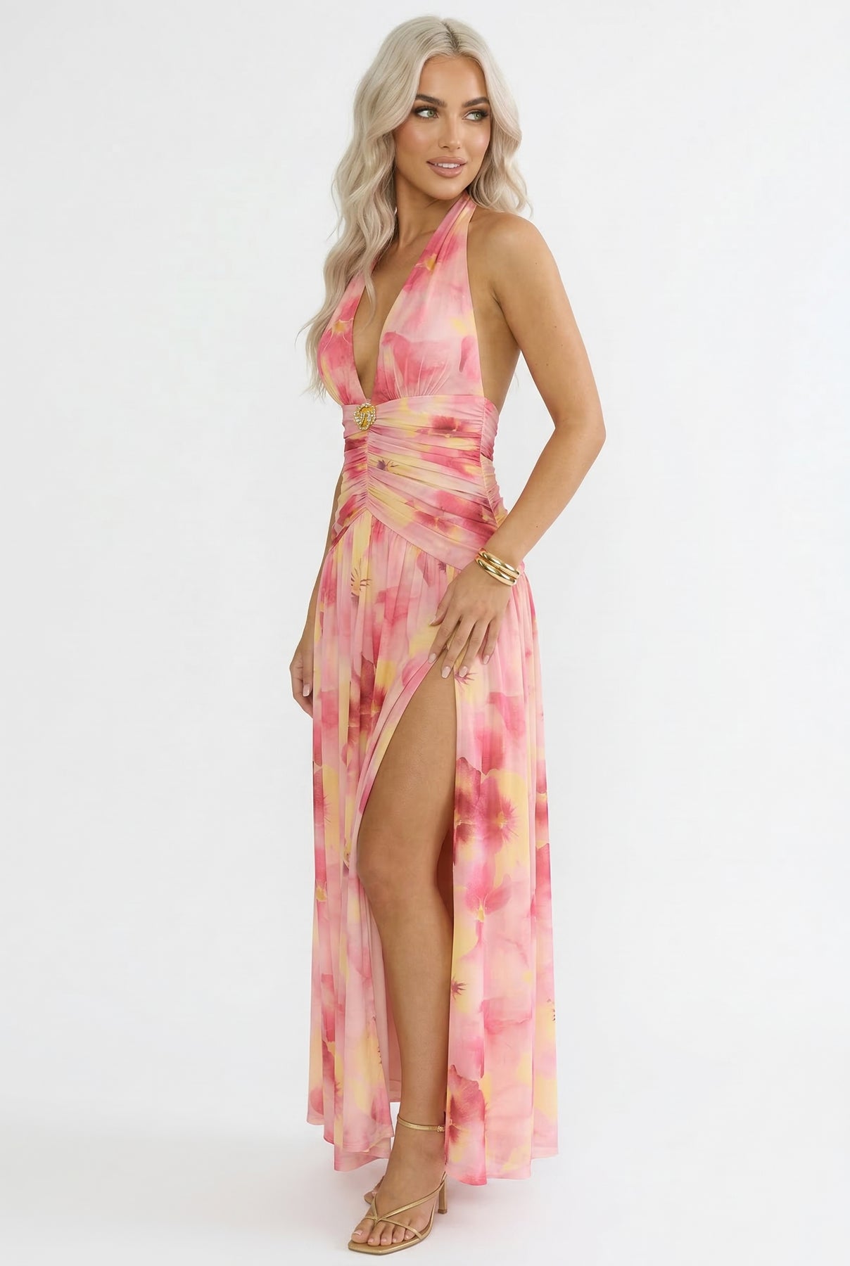 The kind of dress that makes an entrance. The Blush Sunset Halter Maxi Dress features a plunging halter neckline, flattering ruched waist, and a dramatic high slit that moves beautifully as you walk. A soft tropical floral print in warm pink tones gives it that sunset-on-vacation feel, while the gold floral accent at the waist adds a subtle statement detail.