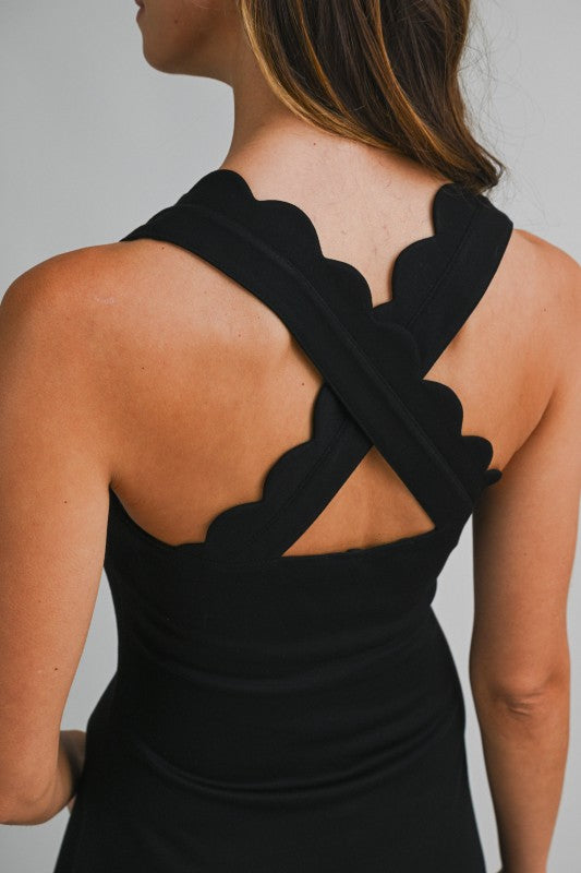 Clean lines with a playful finish. The Country Club Scallop Mini Dress features a flattering square neckline with scalloped trim detailing and a softly structured silhouette that feels polished but easy. Designed in a stretch scuba fabrication with built-in shorts for extra comfort, this is the kind of piece that works from daytime plans to dinner without missing a beat.