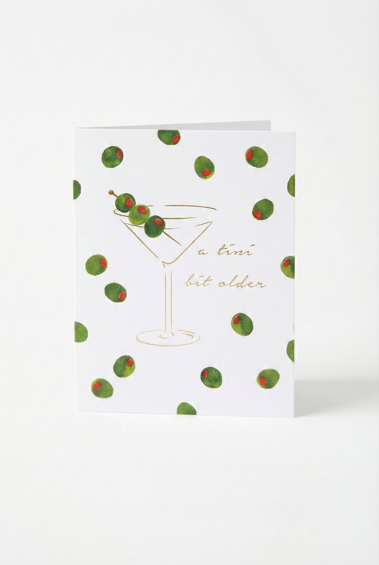 Raise a glass to another fabulous year with our A Tini Bit Older Birthday Card. Featuring hand-painted watercolor olives and a foiled martini glass, this playful design is finished with luxe gold foil lettering. Perfect for the friend who appreciates a good cocktail and an even better laugh.