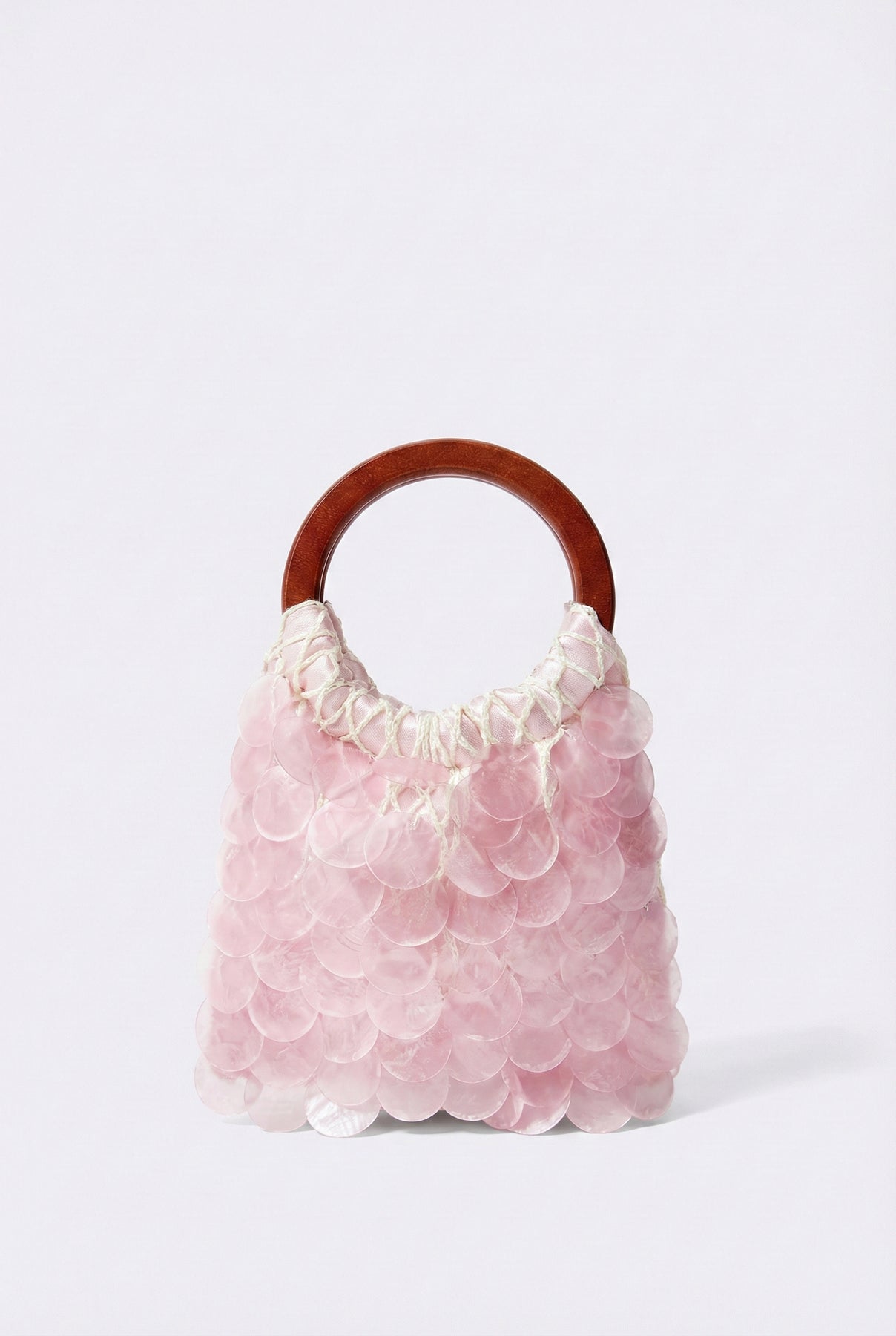 Soft, dreamy, and a little bit magical — the Pink Tides Shell Mini Bag brings texture and shine in the prettiest way. Layered translucent shell discs create movement and light-catching dimension, while the rounded wood handle adds a warm, natural finish. It’s the kind of piece that makes a simple outfit feel instantly styled — perfect for weddings, brunch, or summer nights out.