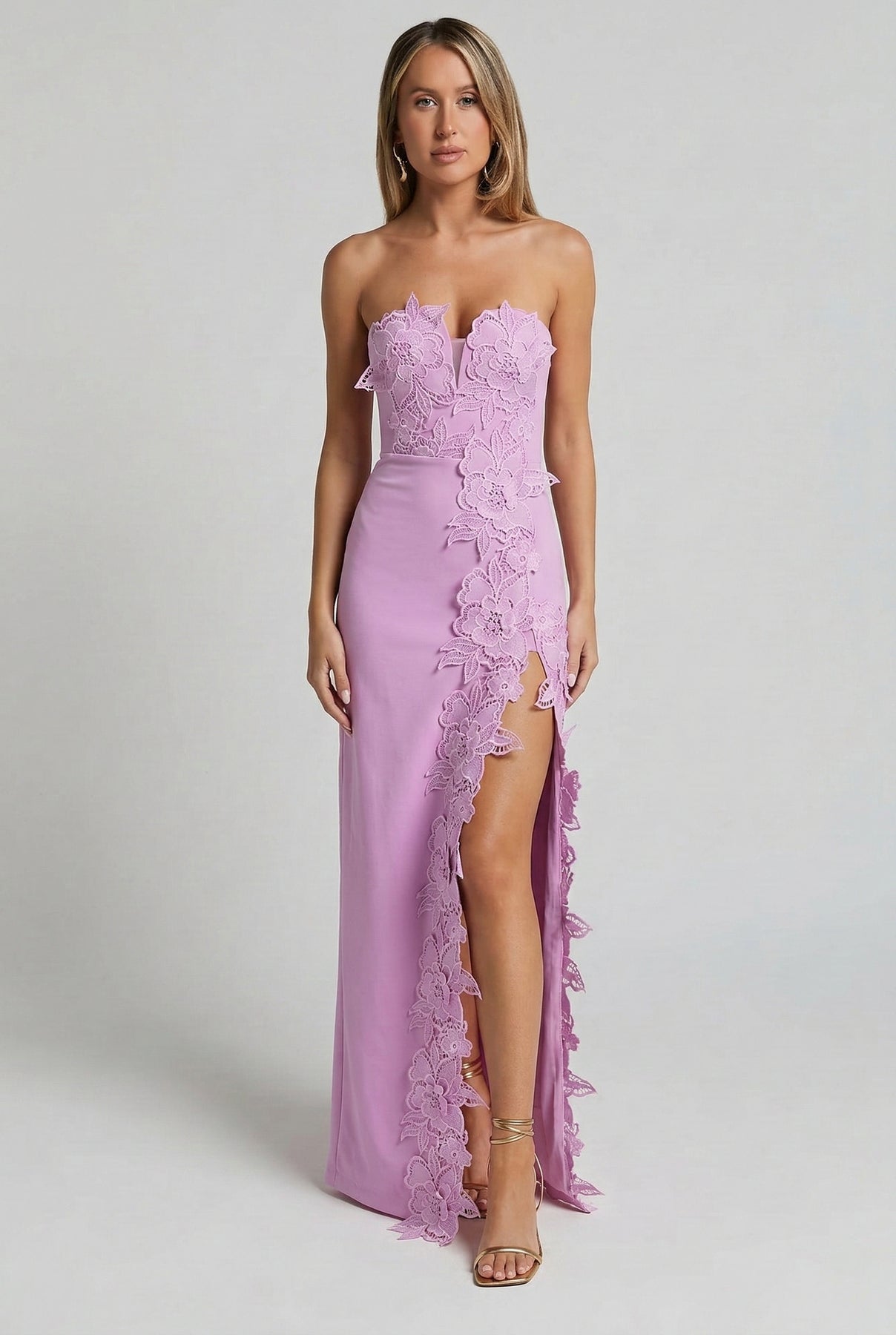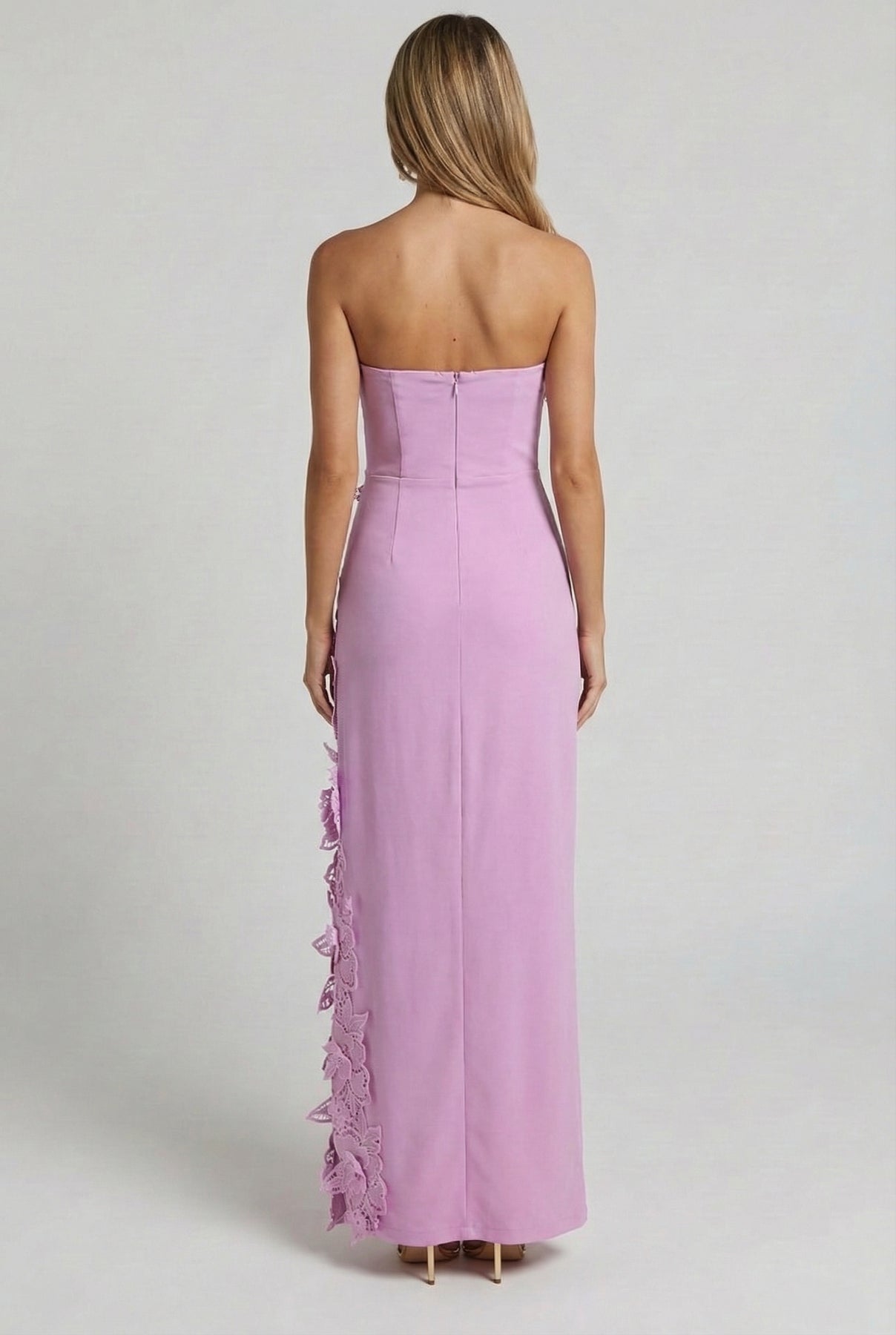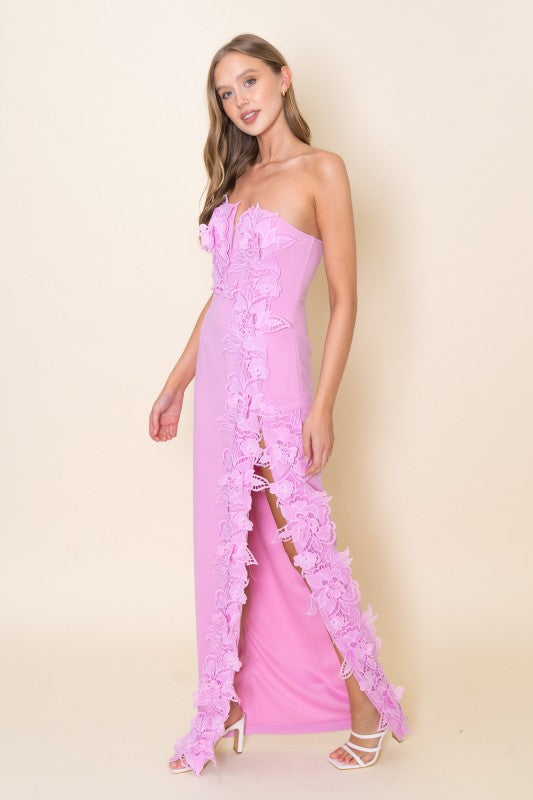 Romantic structure meets modern minimalism. The Éloise Floral Appliqué Maxi Dress is designed with a sculpted strapless neckline and dimensional floral appliqué that trails softly along the silhouette. Clean lines balance the intricate texture, creating a look that feels refined, feminine, and quietly dramatic.