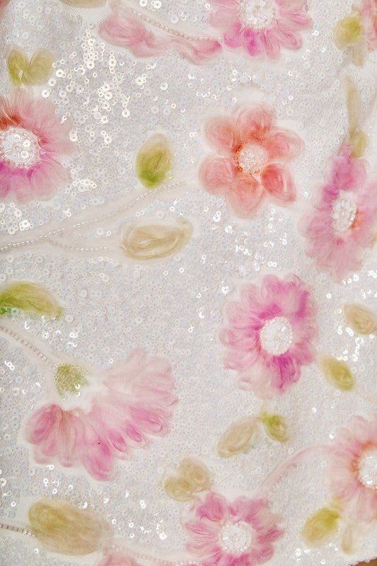 Light-catching texture meets modern restraint. The Floral Sequin Lace Mini Dress is crafted with dimensional floral embroidery layered over a softly structured silhouette, allowing tonal sequins to shimmer subtly rather than overwhelm. The strapless neckline keeps the line clean and architectural, while the slim, sculpted fit creates a polished, composed shape.