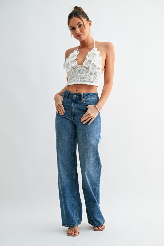 It’s giving fresh flowers, warm air, and nowhere to be but cute. This strapless crochet top features dimensional floral appliqués and a fitted, stretchy band that stays put while showing just enough skin. Easy, playful, and made for sunny days that turn into late afternoons.