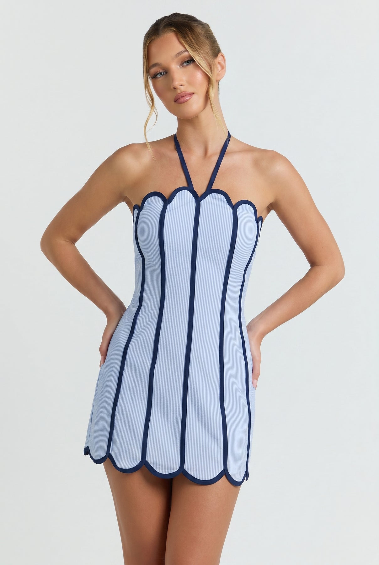 A little flirty, a little tailored, and exactly the kind of mini that makes people stop mid-scroll. The soft vertical stripe paired with contrast scalloped piping creates that sculpted, feminine shape Lithologie girls always reach for — playful but polished enough for dinner, parties, or a last-minute vacation look.