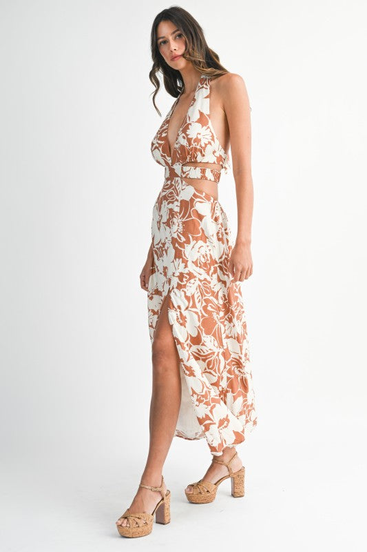 Easy, flattering, and just the right amount of daring. This floral halter midi features a deep neckline with a soft cutout waist and an open back that feels effortlessly feminine without trying too hard. The flowy skirt and side slit keep it light and wearable, while the print does all the talking. It’s the kind of dress you throw on and instantly feel styled — brunch, vacation, date night, or anywhere warm-weather plans take you.