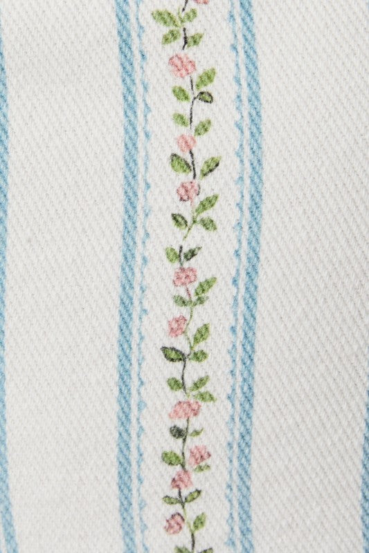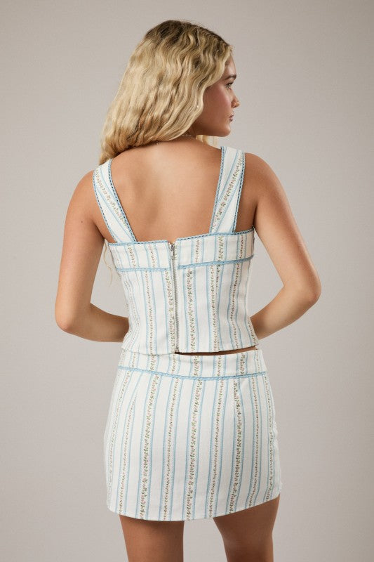 A fitted sleeveless top with a structured square neckline and subtle lace trim detailing. Designed with wide straps for support and a clean, tailored shape that sits just at the waist. The striped pattern adds texture while keeping the look polished.