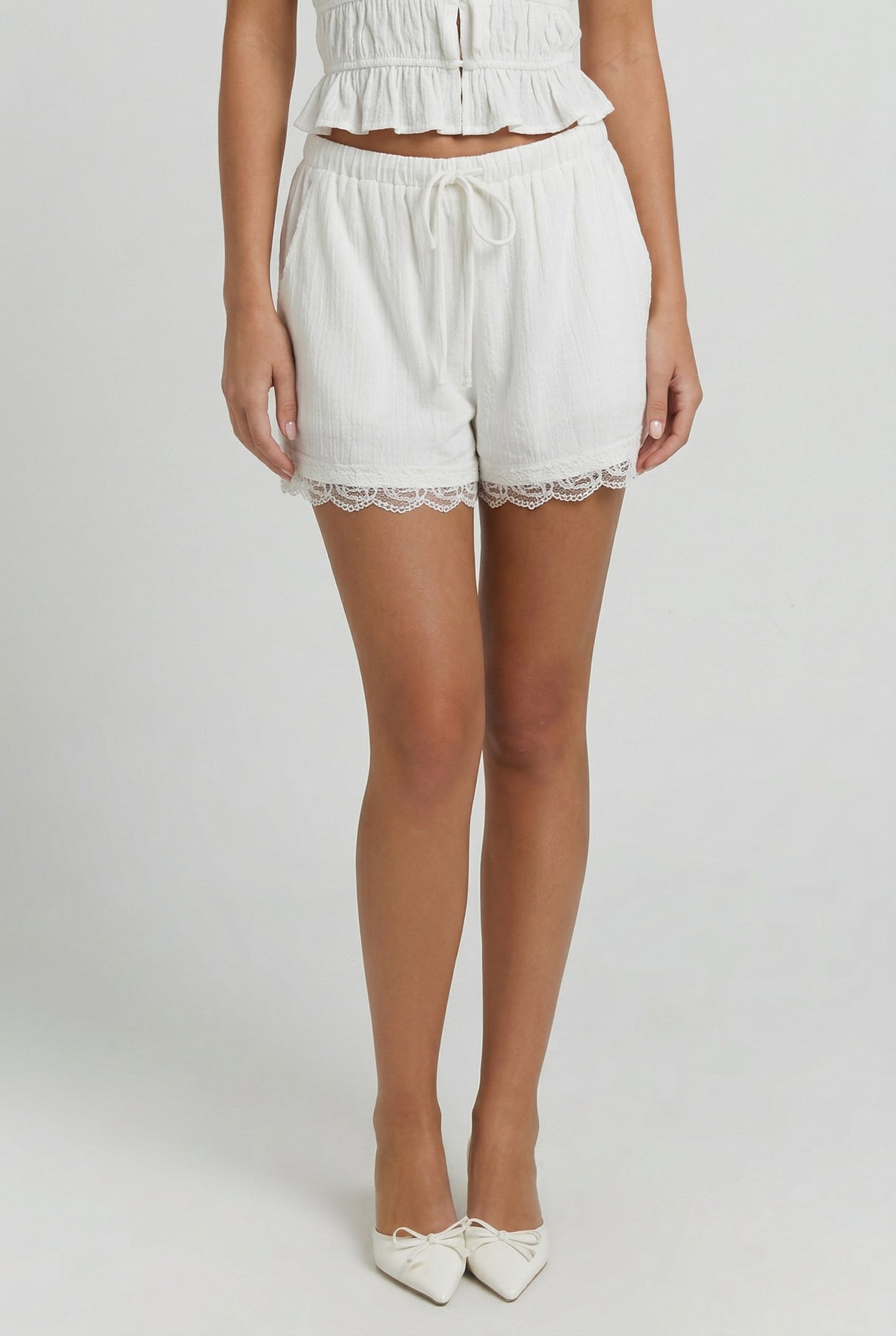 The Afternoon Out Lace Linen Shorts have a relaxed fit with a soft waistband and just enough detail at the hem. They sit easy, feel light, and go with everything — especially the matching top.