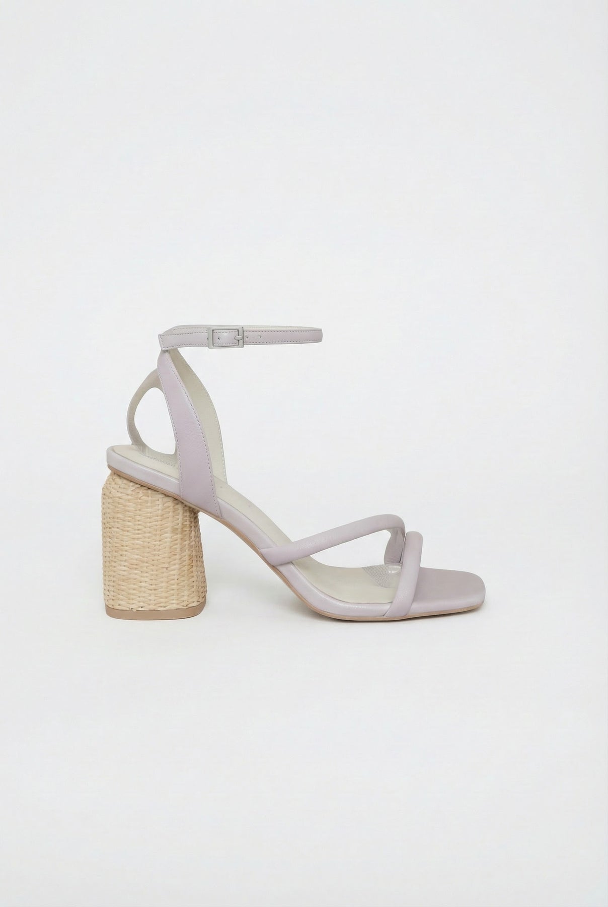 Step into sunshine with the Alaia Strappy Raffia Heeled Sandal. This chic lavender block heel features delicate straps, a raffia-wrapped heel, and a soft padded insole for all-day comfort.