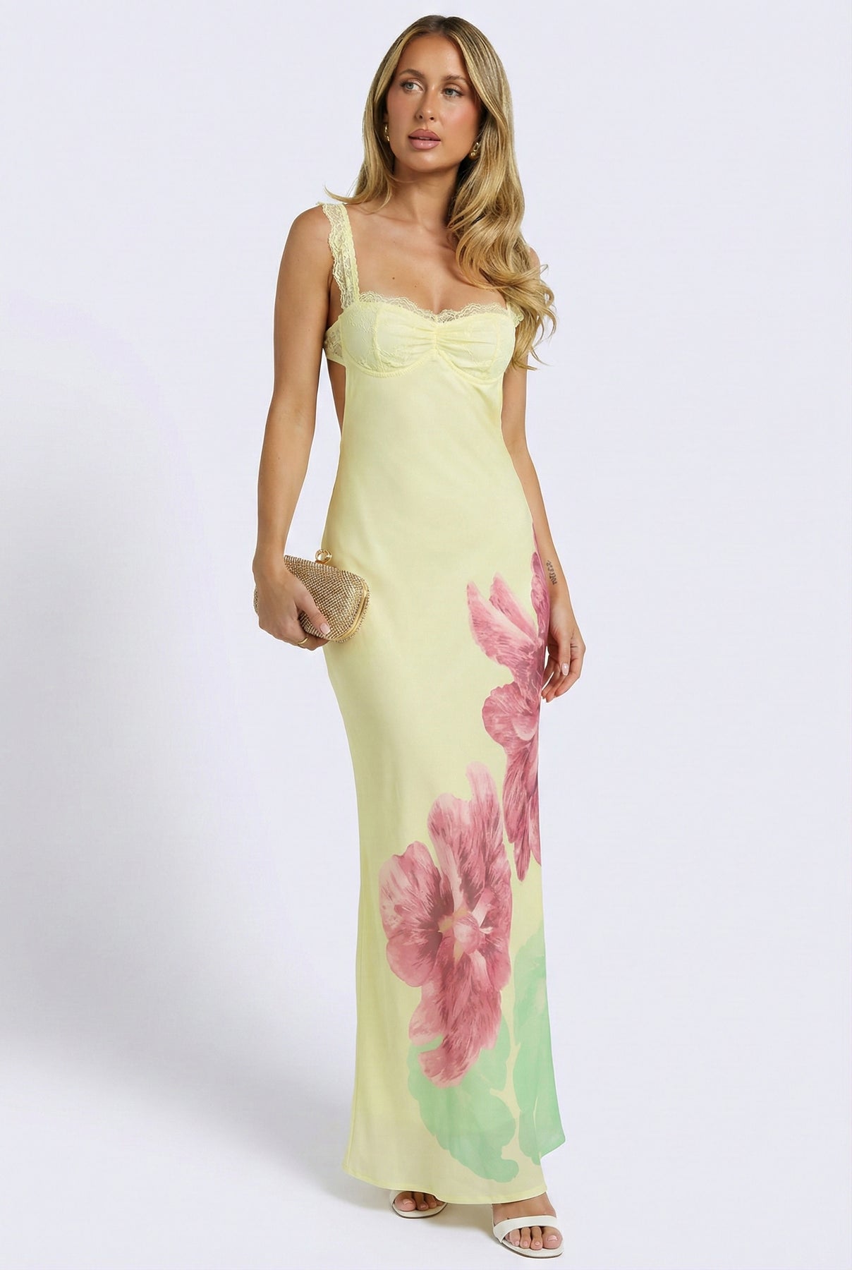 A soft, feminine maxi with an easy, flattering shape. Designed with delicate lace straps, a ruched sweetheart neckline, and an adjustable open-back tie. The floral print adds visual interest without feeling overdone, while the lightweight fabric drapes smoothly through the body.