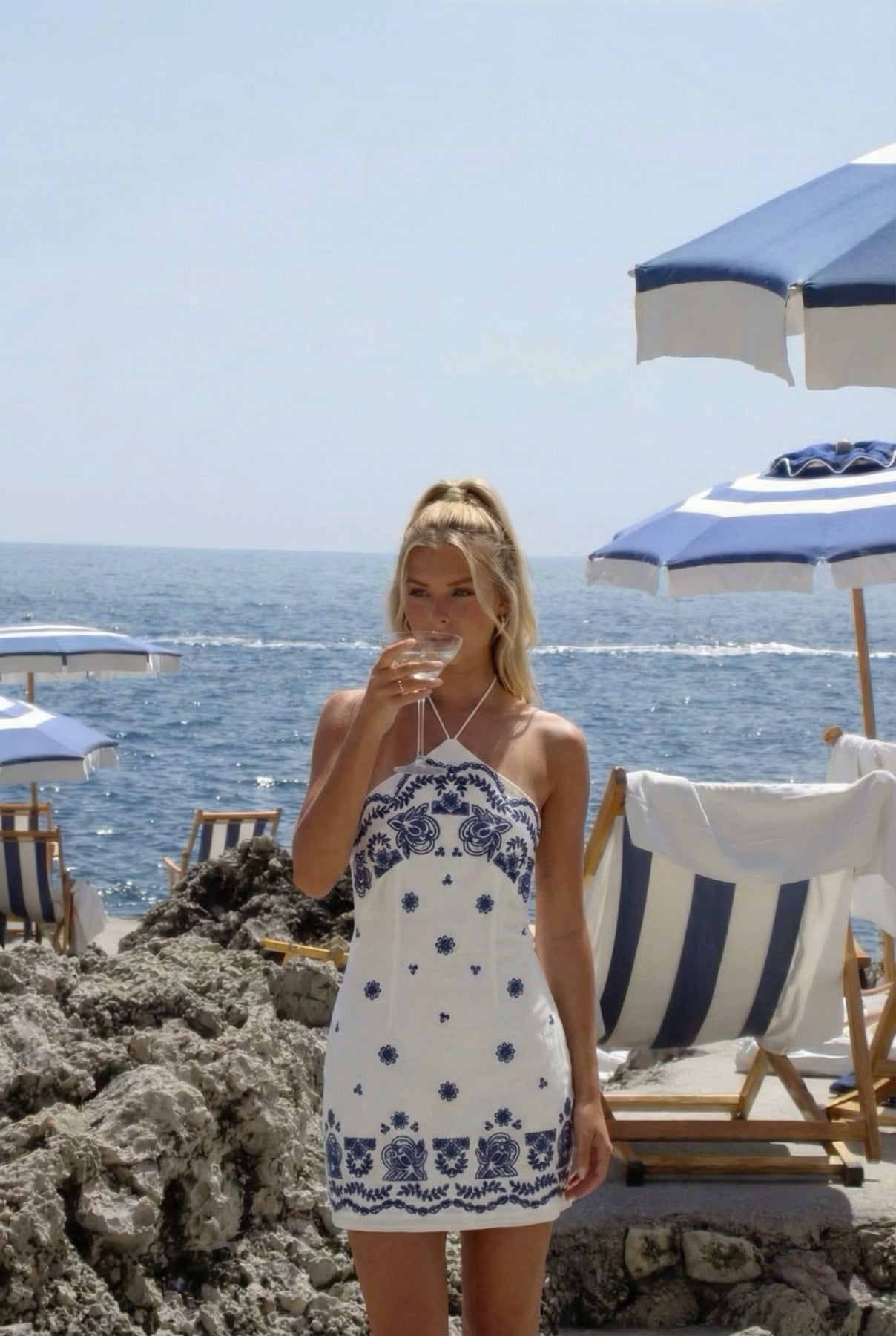 Step into easy, sunny style with our Paritza Embroidered Halter Mini Dress. This pretty mini dress has a beautiful embroidered halter neckline on a solid color, making it a fun and bright choice for warm days. The dress features an open back with a self-tie detail that adds a playful twist. It is fully lined for comfort and made from soft, lightweight rayon, perfect for beach outings or summer parties.