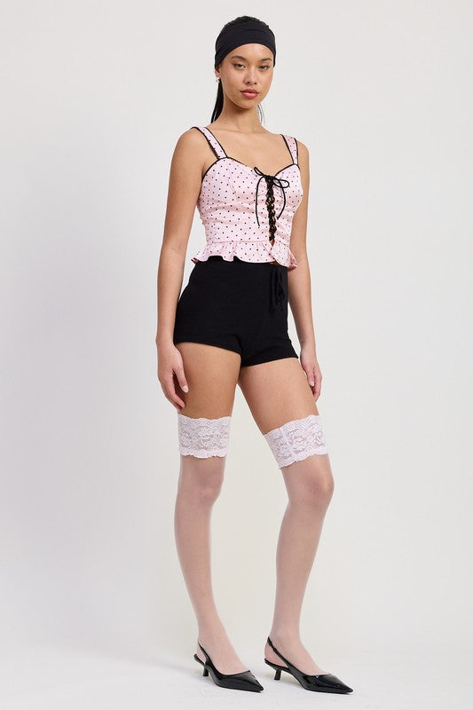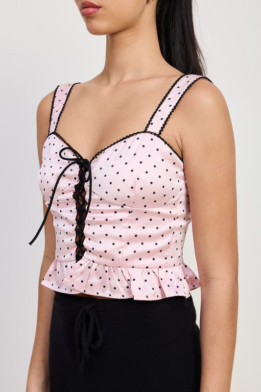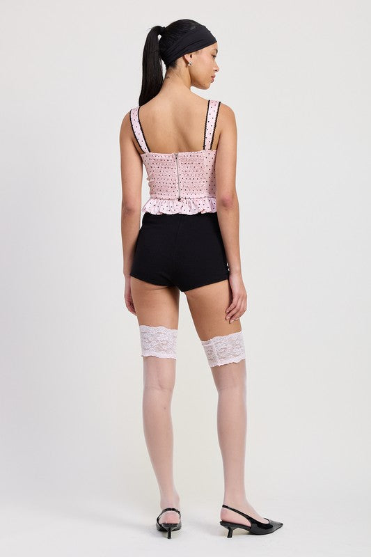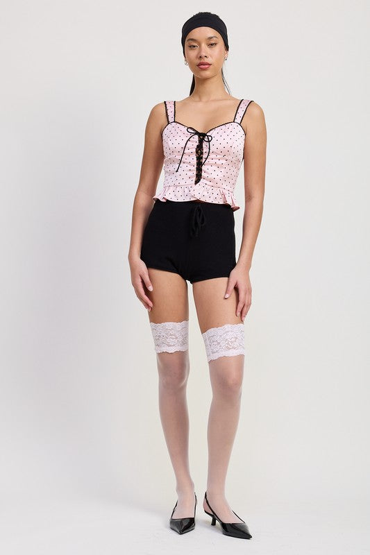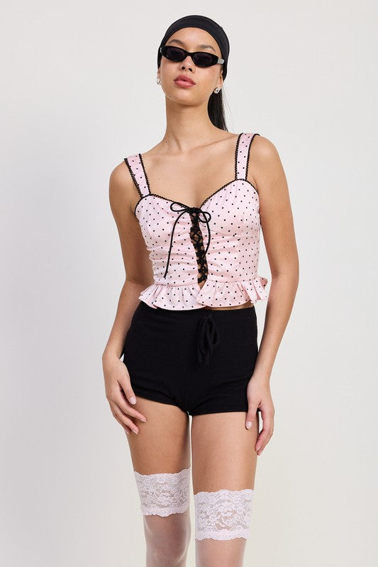 A little sweet, a little bold — the Sugar Plum Corset Top brings the prettiest mix of romance and confidence. Designed with a pink satin floral print, black lace trim, and front ribbon tie, it channels that modern vintage energy that feels both flirty and sophisticated. The structured corset silhouette flatters the waist while the adjustable straps ensure the perfect fit. Style it with trousers, a mini skirt, or denim for a statement look that’s pure main character energy.