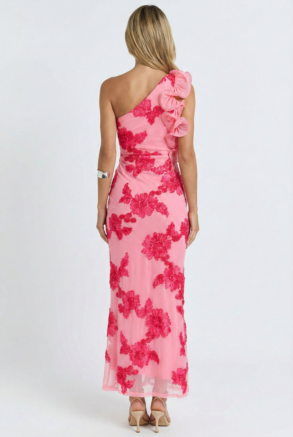 A statement maxi with an asymmetric silhouette and bold floral detail. Designed with a one-shoulder neckline and a dramatic ruffled sleeve, this fitted bodice flows into a long, streamlined skirt. The sheer floral embroidery adds texture while keeping the look refined and event-ready.