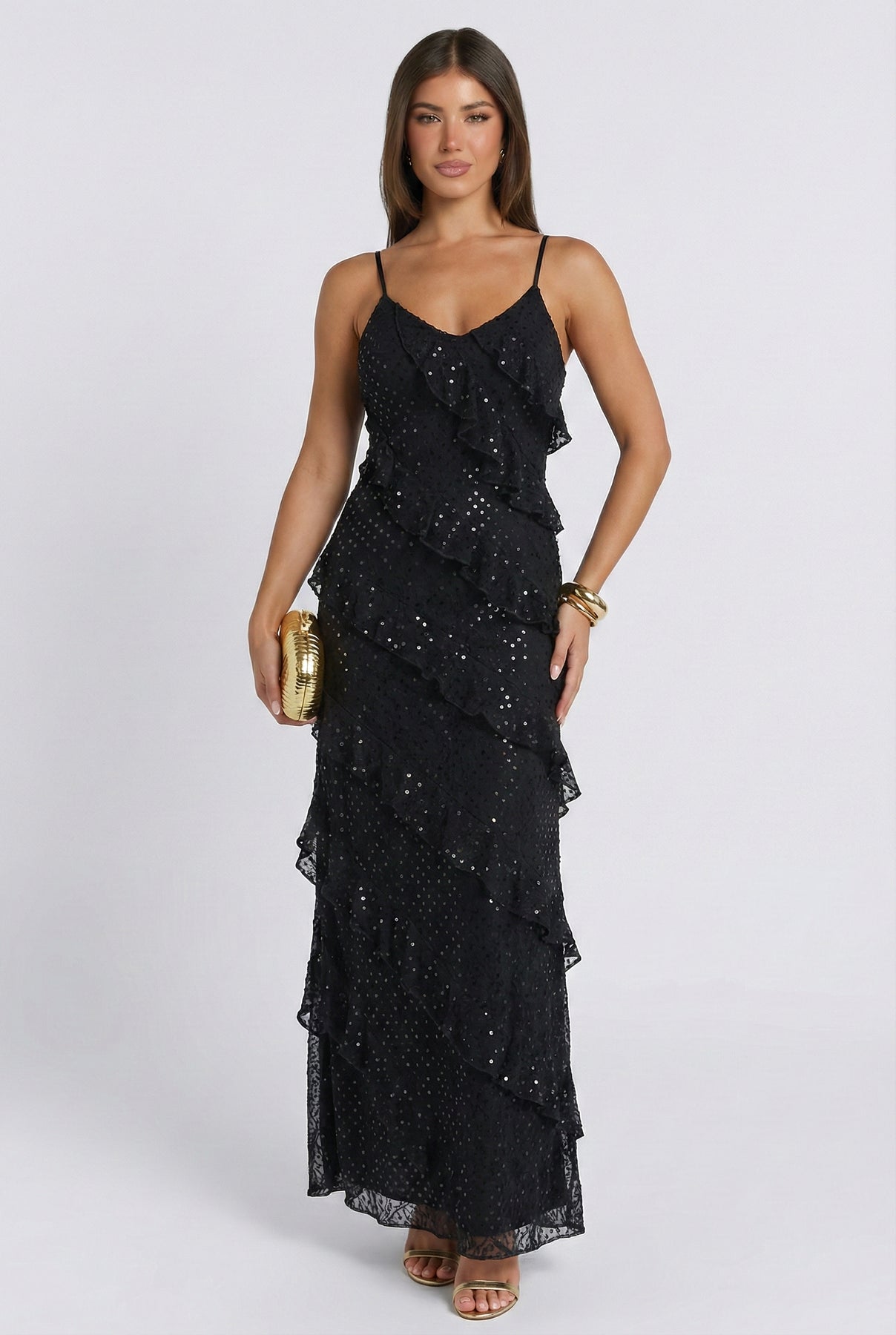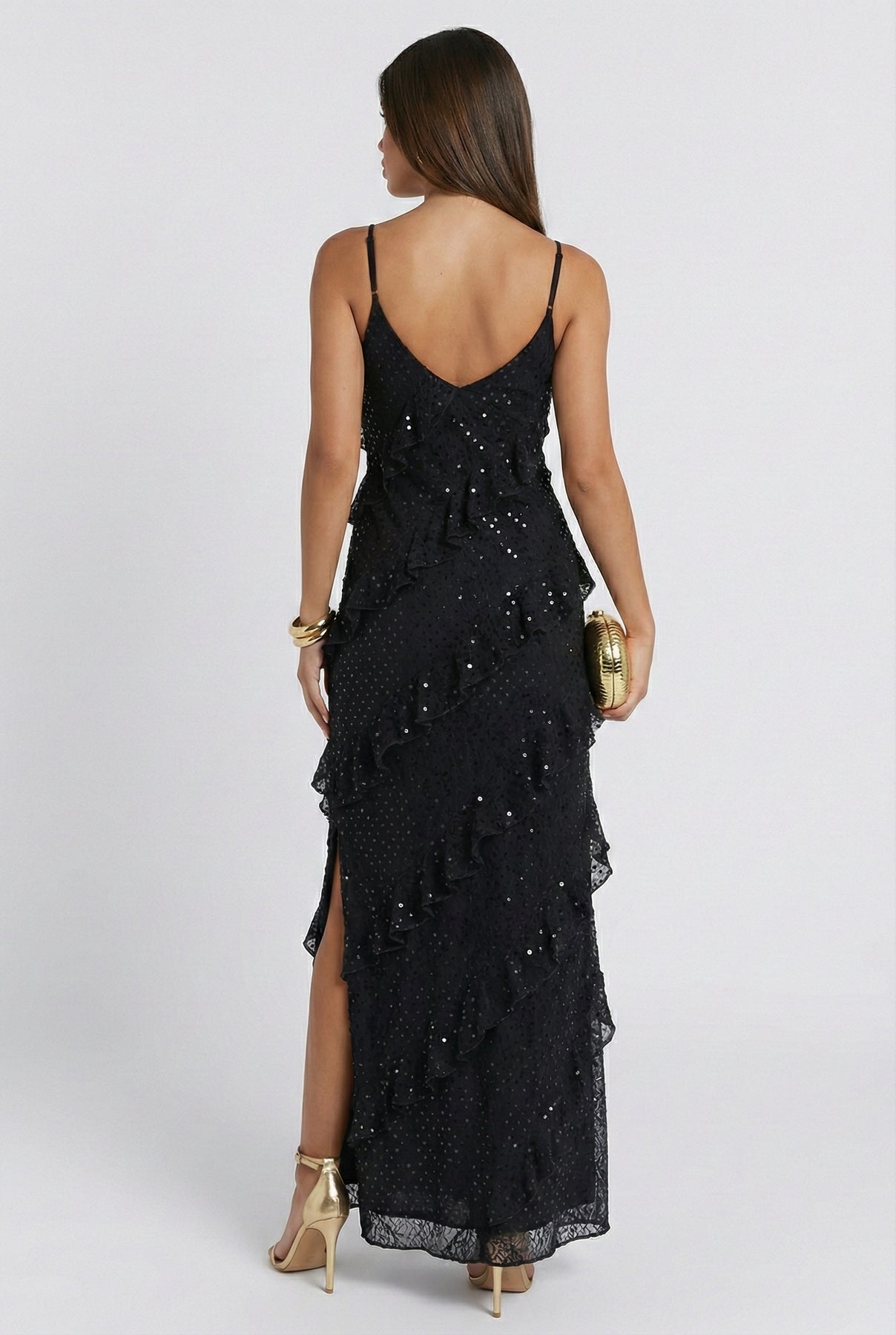 Shine brighter than the night sky in the Celestelle Asymmetrical Sequin Ruffle Tiered Maxi Dress. Designed with cascading asymmetrical ruffles, delicate lace overlays, and shimmering sequins that catch every ray of light, this gown is pure magic. A flattering V-neckline and adjustable spaghetti straps balance elegance with ease, while the side slit brings a modern, sultry touch. Perfect for weddings, galas, and unforgettable nights out — this maxi is the definition of show-stopping.