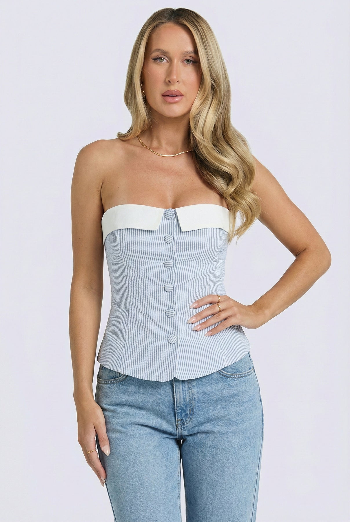The Folded Stripe Corset Top brings a refined take on classic tailoring with a modern, feminine edge. Designed with a softly folded neckline and vertical pinstripes that lengthen the silhouette, this piece feels polished yet effortless. The structured button-front detail creates a flattering corset-inspired shape without feeling restrictive, making it an easy statement for elevated everyday styling.