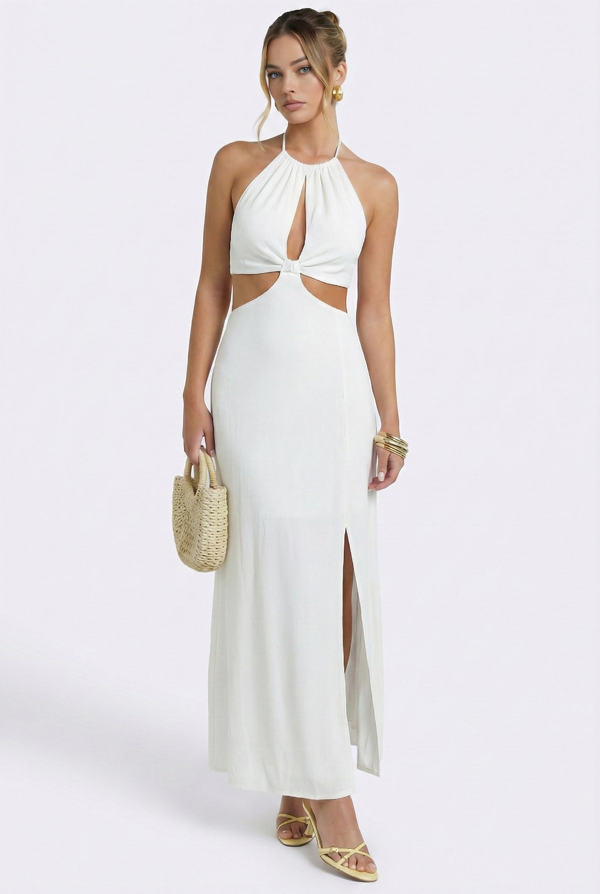 The Weekend in Napa Halter Maxi Dress is made for sun-soaked days and warm, breezy nights. Designed with a halter neckline and lace-up back tie, this maxi flatters your shape with elastic bust and waist cut-outs for the perfect custom fit. The flowy silhouette moves effortlessly from brunches and vineyard strolls to weddings and beachside evenings.